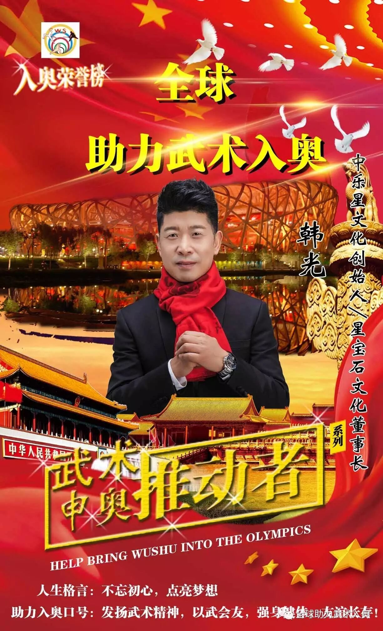 回到北京后,就马上把这首歌做了出来,我记得录音的时候,我是含着眼泪把这首歌唱完的,而且只录了两遍就过关了。这首歌一经推出,就得到了大家的共鸣,在没有任何宣传的情况下,短短十天,在朋友圈里点击率超过百万,转发量超过四万,说明这首歌深深地勾起了大家内心最脆弱的那份情感!接下来的各种公益活动,如《模特春晚》《百姓春晚》《民间春晚》等各种春晚都邀请我唱这首《让爱回家》,这首歌也顺利顺理成章地成了我的代表作,虽然编曲部分在专业人士眼里还不够完美,但情感部分还是被普遍认可,记得在邯郸的一家敬老院演出的时候感动了在场的所有老人和爱心人士。2015年年底,在我老家河南巩义开了我的首场“让爱回家新春答谢音乐会”,市长,宣传部长等领导以及词作家丁伟先生,我的家人,同学,朋友和市民都挤满了演出现场,因为场地有限好多人都进不来,只能在外边听我唱歌。现在正在和丁伟先生合作最新作品《寻找》,期待这首作品能够引起大家的共鸣! “激发斗志,改变命运,助力武术入奥,团结中华民族的凝聚力,实现中国梦” 2016年10月的某一天,首届世界杯武术套路比赛组委会孙朱平先生给我打来电话,说现在正在全国征集大赛主题歌,看能否参赛试试看。当时我正在做一家上市公司的40周年厂庆及新产品下线仪式活动,每天忙的不可开交,但是这个国际级的比赛活动还是深深地吸引了我的目光,再加上从小对武术人的敬仰及中华武术的博大精深内涵的膜拜,还是让我控制不住内心的澎湃激情,连夜创作了《斗志搏云天》的曲子,很荣幸的是国家体育总局最终采纳了我的这首曲子,当然也离不开作词人王宏先生的大气之笔。在各方人士的共同努力下,有十个奥运冠军演唱的主题歌得到了高度认可,取得了国际顶级赛事的圆满成功!“共筑中国梦,重塑武术魂”也成了各国来宾津津乐道的话题!