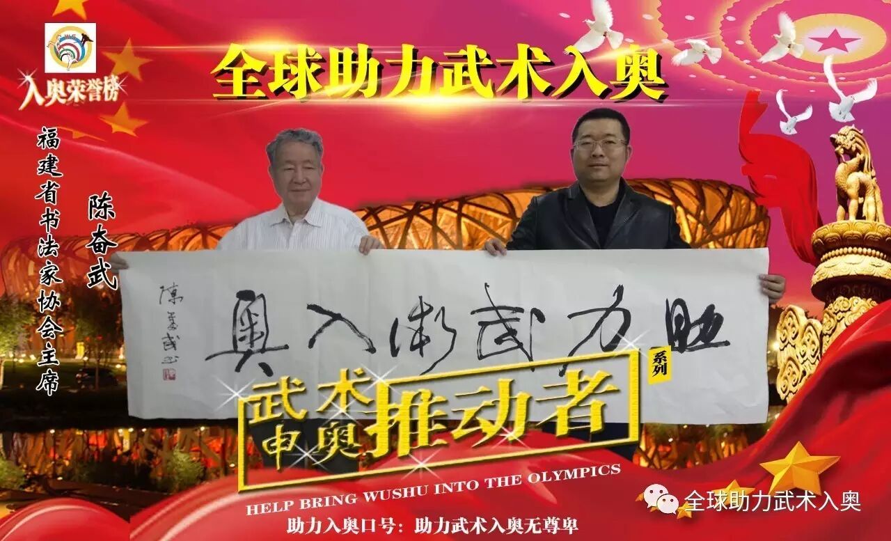 福建省书法家协会陈奋武主席长期关心“助力武术入奥”的进展,多次在不同场合为“助力武术入奥”呐喊和站台。陈奋武老师常说助力武术入奥没有尊卑之分,我们都有一颗中国心必须为武术入奥尽力。