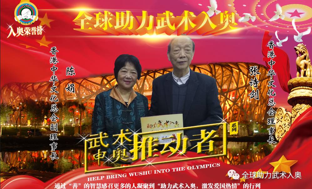 旅港多年的张诗剑夫妇将毕生精力致力于文学研究和创作,希望向全世界传播中华优秀传统文化。2017年12月,在得知助力武术入奥团队到香港推动武术入奥,弘扬中华武术后,张诗剑夫妇主动联系,希望通过自己的力量共同推动武术入奥,团结中华民族的凝聚力,为中华文化融入世界贡献一份力量。张诗剑先生现为《香港文学报》执行主编,作品《香妃梦回》被选入中国文学的经典之作。其夫人陈娟长篇小说《昙花梦》出版后一时轰动文坛,并被改编成同名热播电视剧。虽然旅港多年,张诗剑夫妇仍然心系祖国,热切期盼中国武术申奥能够早日成功。他们表示,今后将呼吁更多的海内外华人同胞加入到助力武术入奥的行列,共同推动中华文化融入世界大舞台。