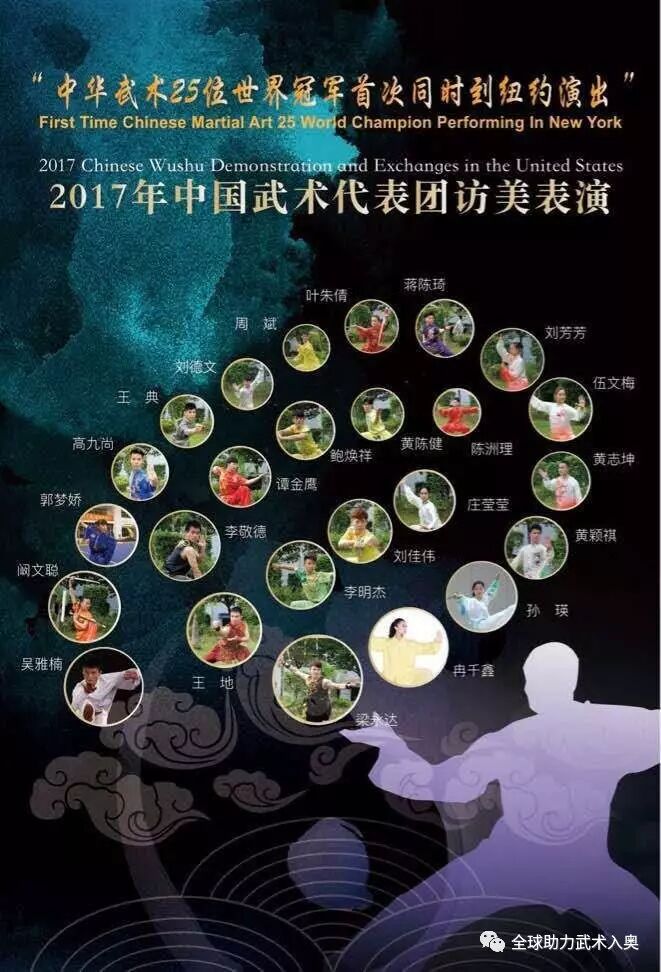 为弘扬中华传统文化,展示中国武术风采,推动武术早日进入奥运会比赛项目。由中国国家体育总局副局长赵勇带队,由25位武术世界冠军、亚洲冠军组成前所未有的武林高手阵容,将在联合国、时代广场、曼哈顿百老汇剧场举行武术表演与交流活动,并于9月12日在曼哈顿中城著名的Town Hall剧场进行精彩的武术表演。据悉第一届世界杯武术套路比赛的形象大使——功夫巨星李连杰也将出席本次活动。
