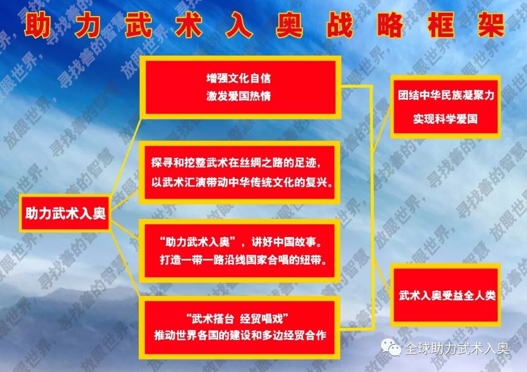助力武术入奥团队积极探寻和挖整武术在历史上丝绸之路的足迹;组织武术重走丝绸之路,讲好中国故事。“一带一路”不是中国在独奏,武术有望成为沿线国家合唱的纽带。 助力武术入奥团队积极探寻和挖整武术在历史上丝绸之路的足迹;组织武术重走丝绸之路,讲好中国故事。“一带一路”不是中国在独奏,武术有望成为沿线国家合唱的纽带。