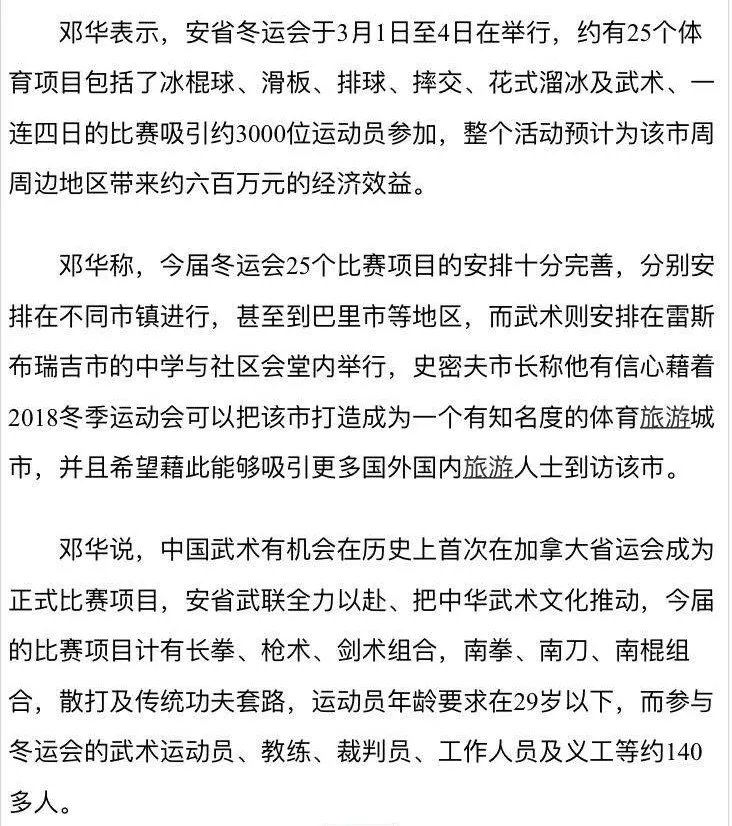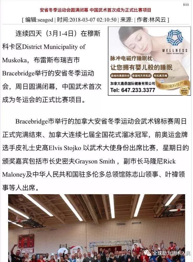 连续四天(3月1-4日)在加拿大穆斯科卡区(District of Municipality Muskoka)布雷斯不瑞吉市(Bracebridge)举行的安省首届冬季运动会,周日圆满成功,参与冬运会的武术运动员、教练、裁判员、工作人员及义工约140多人。中国武术首次成为冬运会的正式比赛项目,事实证明越来越多的西方国家开始吸收和推广以武术为代表的中国传统文化。